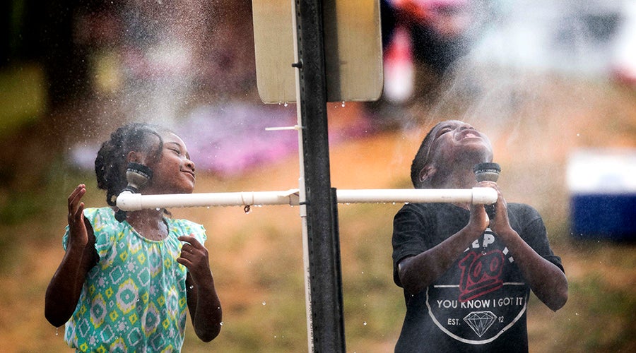 Alana Ball, and her cousin Zaielyn Johnson, beat the July heat with the help of the cool water coming from the misters set up by the city of Salisbury Parks and Recreation department near the city softball fields. (Jon Lakey, Salisbury Post)