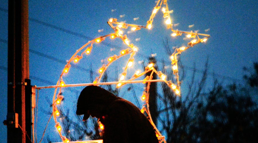 A Brookhaven Electric worker helps bring some Christmas cheer by installing lights on Brookway Boulevard. (Luke Horton | The Daily Leader)