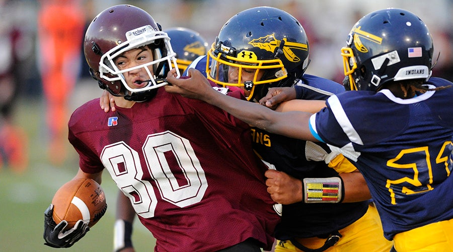 Bath’s Austin Frazier tries to fight off Chocowinity defenders My’Quan Clark (21) and Jamie Corprew (9) during a middle school football game in Beaufort County, North Carolina. (Ashley Vansant | Washington Daily News)