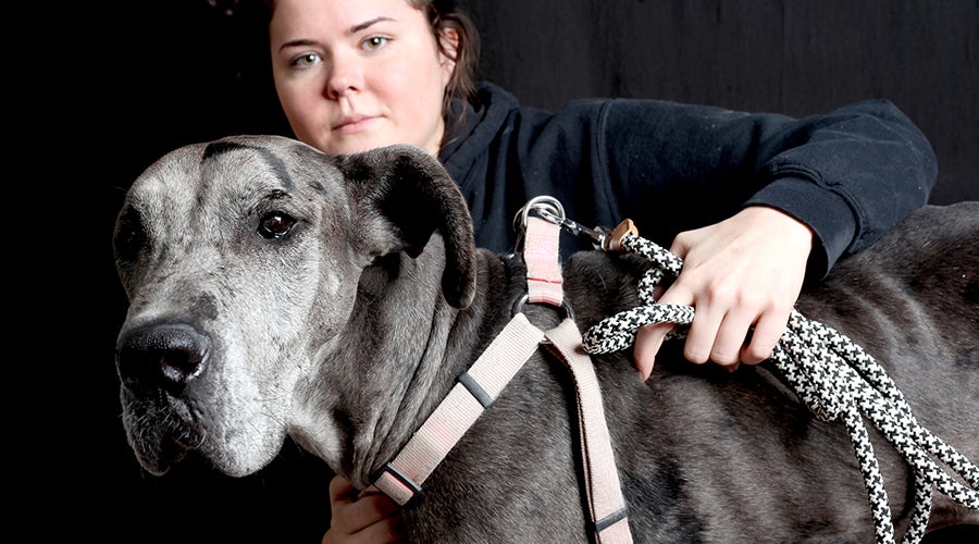 Alexa Jeffers, a co-founder of the Vicksburg-based animal rescue ‘Helping Animals Reach Tomorrow,’ is pictured with Riley, a 2-year-old Great Dane who was shot by its previous owner. (Tim Reeves | The Vicksburg Post)