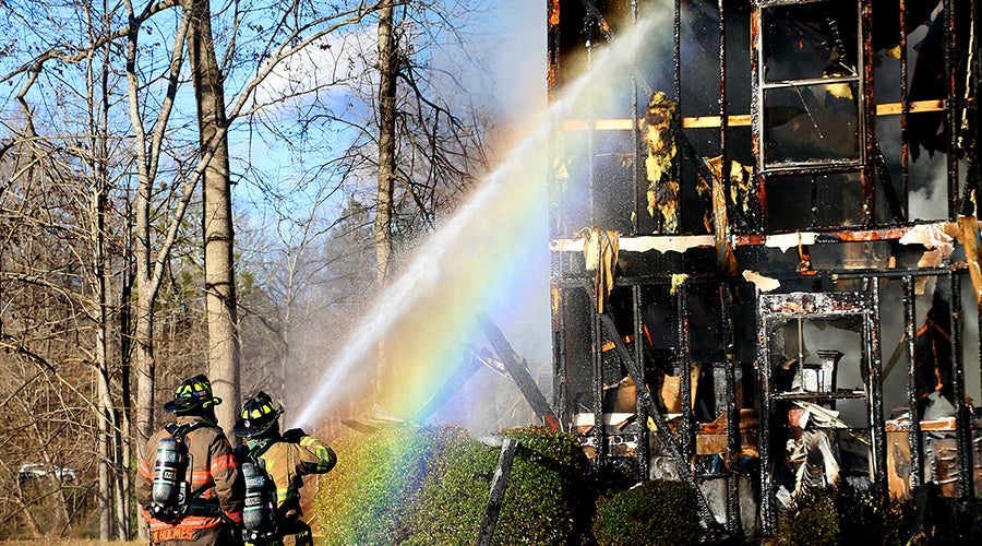 Volunteer firefighters work to contain a fire that ultimately consumed an apartment building at The Landings Apartments near Vicksburg. A total of 12 apartments were destroyed in the afternoon blaze. (Terri Cowart Frazier | The Vicksburg Post)