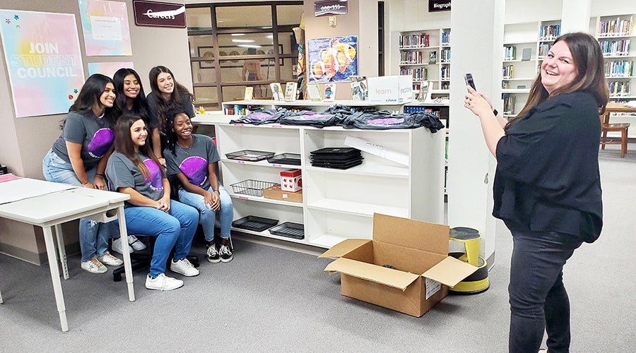 Port Neches-Groves High School librarian Candice Curran, right, smiles as she pauses while taking a photo of some student council representatives. (Mary Meaux/The Port Arthur News)