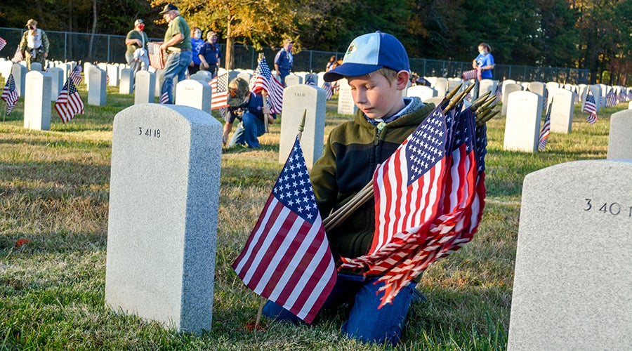 Adam Balgavy places a flag at a grave at Albert G. Horton Jr. Memorial Veterans Cemetery in Suffolk. (Jen Jaqua/Suffolk News-Herald)